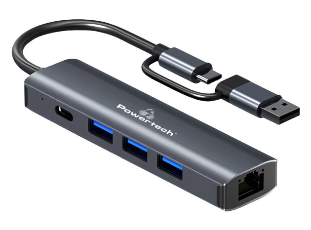 POWERTECH USB hub PTR-0150 με θύρα δικτύου, 4 θυρών, USB & USB-C, γκρι