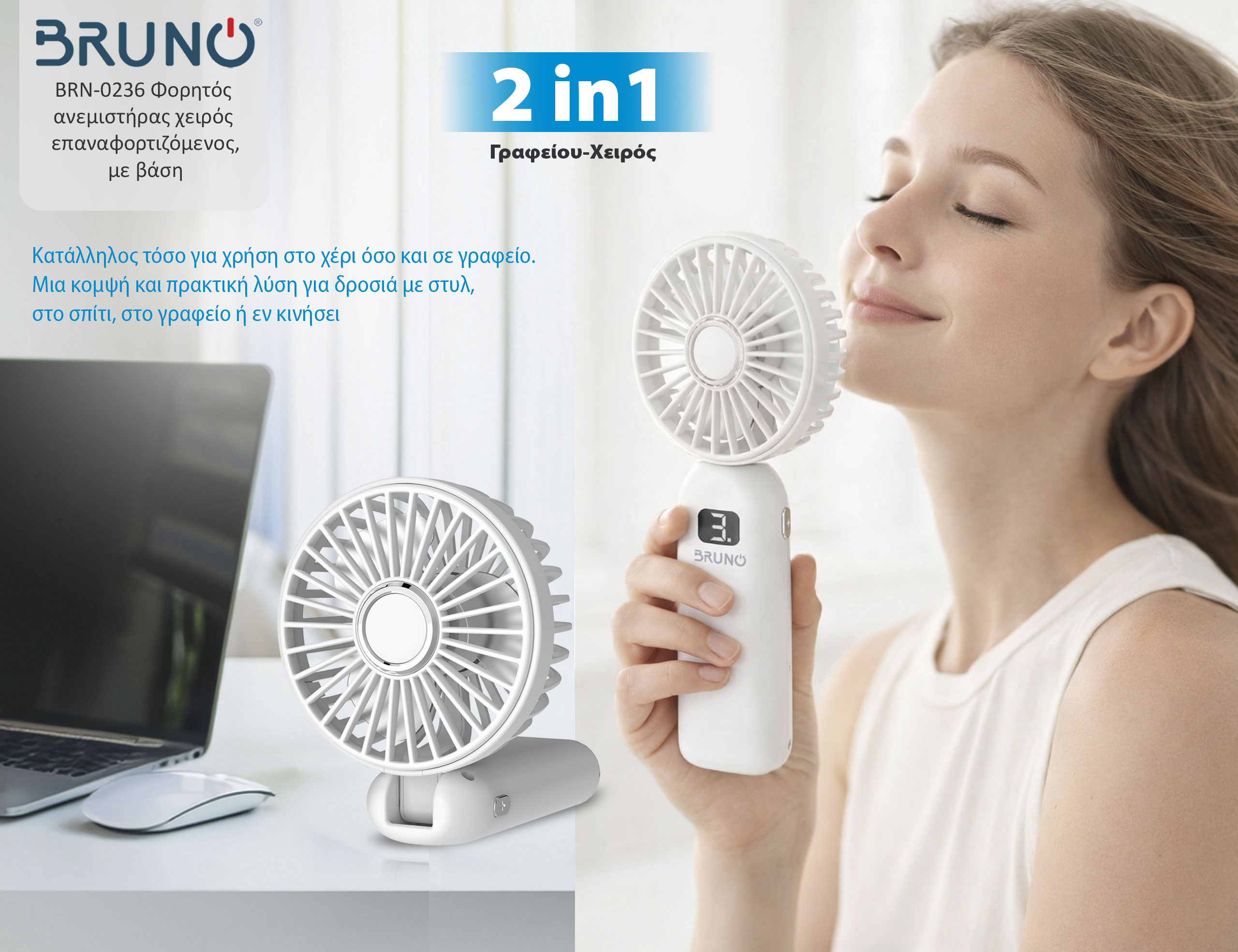 BRUNO φορητός ανεμιστήρας χειρός επαναφορτιζόμενος BRN-0236, με βάση, λευκός-γκρι