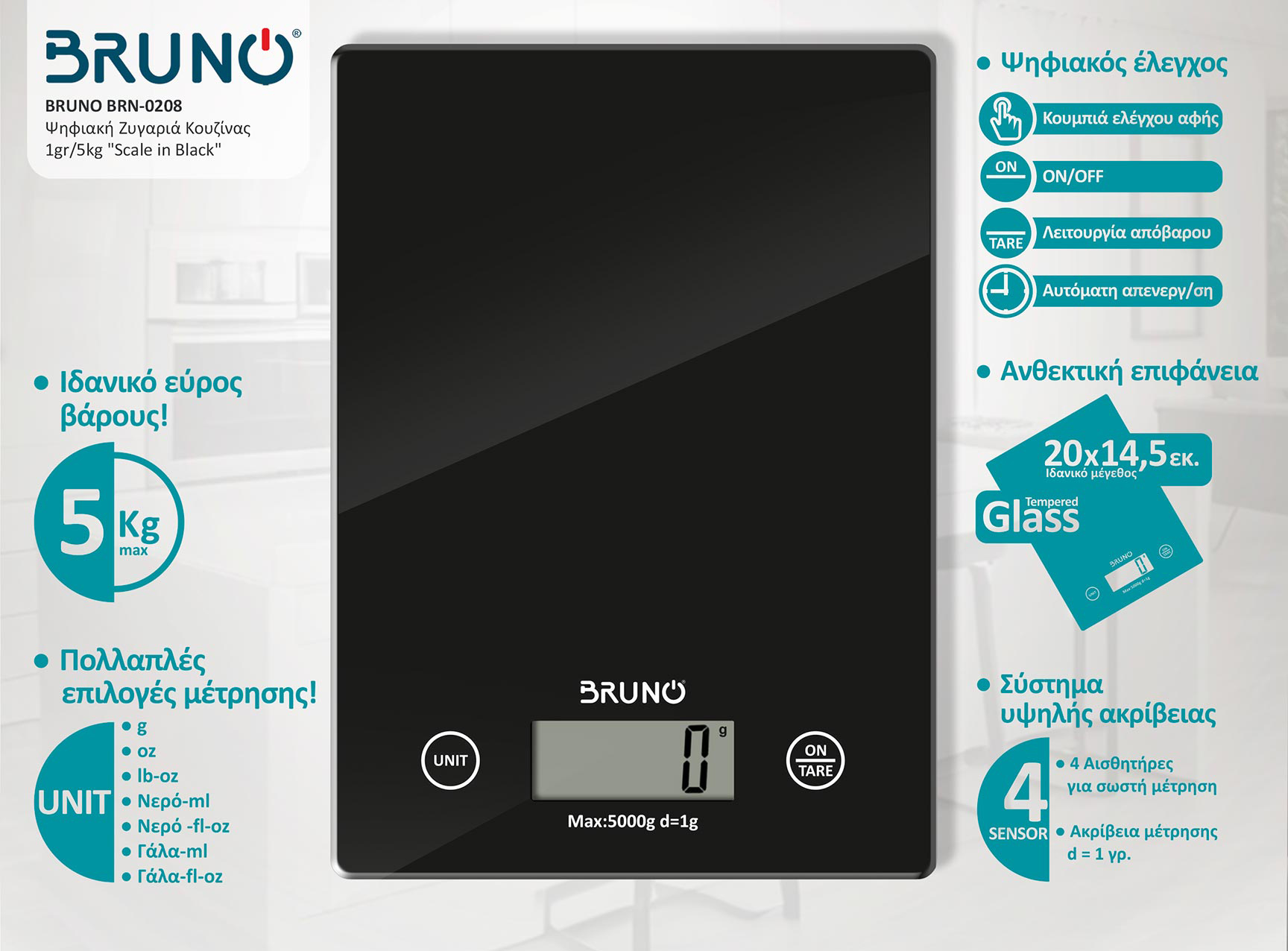 BRUNO ψηφιακή ζυγαριά κουζίνας BRN-0208, 1gr/5kg, Scale in Black