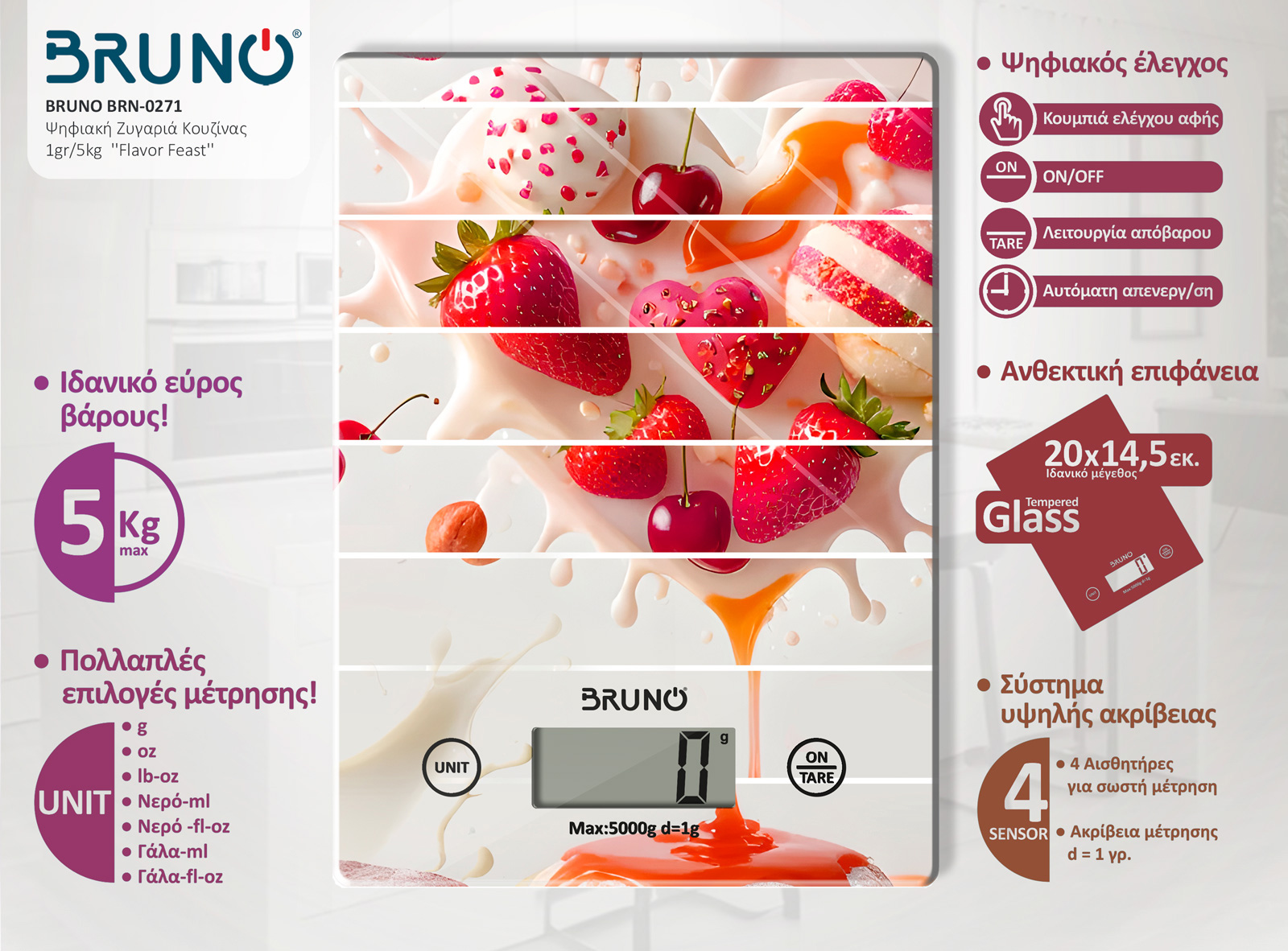Η ψηφιακή ζυγαριά BRUNO BRN-0271 “Flavor Feast” αποτελεί ένα απαραίτητο εργαλείο για κάθε σύγχρονη κουζίνα. Απαραίτητη στην μαγειρική και ιδιαίτερα στη ζαχαροπλαστική βρίσκεται στην λίστα με τα must-have εργαλεία κάθε νοικοκυριού.