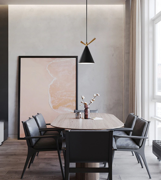 Κομψό, κρεμαστό φωτιστικό οροφής σε σχήμα κώνου με προσεγμένο φινίρισμα που θα προσφέρει στον χώρο σας έναν όμορφο τόνο. Το καλαίσθητο σχέδιο του προσδίδει συμβατότητα σε κάθε χώρο, ταιριάζοντας αρμονικά είτε σε μοντέρνο είτε σε πιο παραδοσιακό περιβάλλον. Το φωτιστικό είναι κατασκευασμένο από μέταλλο με χρυσή λεπτομέρεια που δίνει μια ιδιαίτερη νότα στο σύνολο.