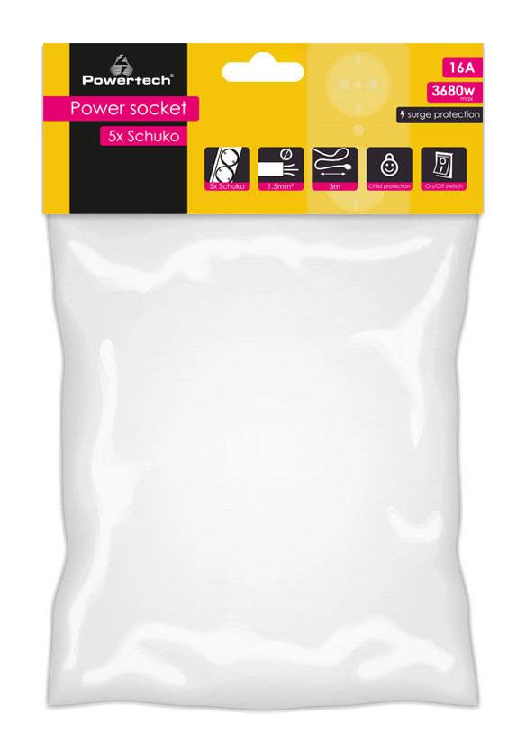 POWERTECH πολύπριζο ασφαλείας PT-883, 5x schuko, 16A, 3m, μαύρο