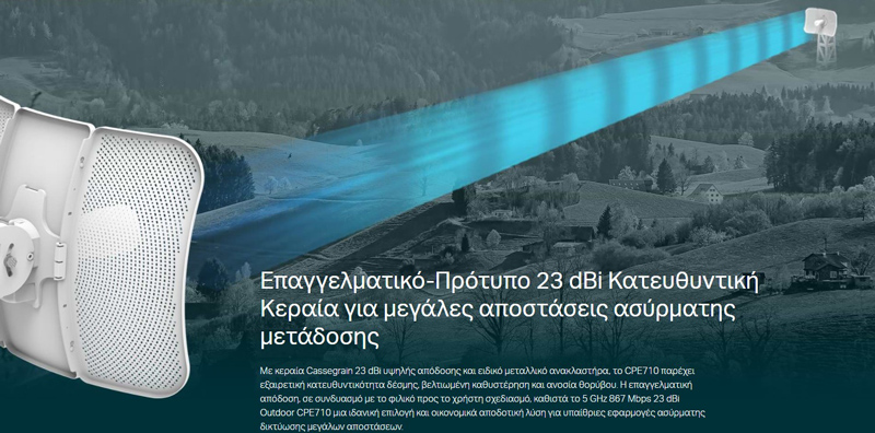 Το CPE710 της TP-LINK με υψηλής απόδοσης κεραία 23 dBi 2 x 2 MIMO, προσφέρει σταθερό Wi-Fi για μετάδοση σε μεγάλες αποστάσεις με ταχύτητες έως 867Mbps στη ζώνη 5GHz.